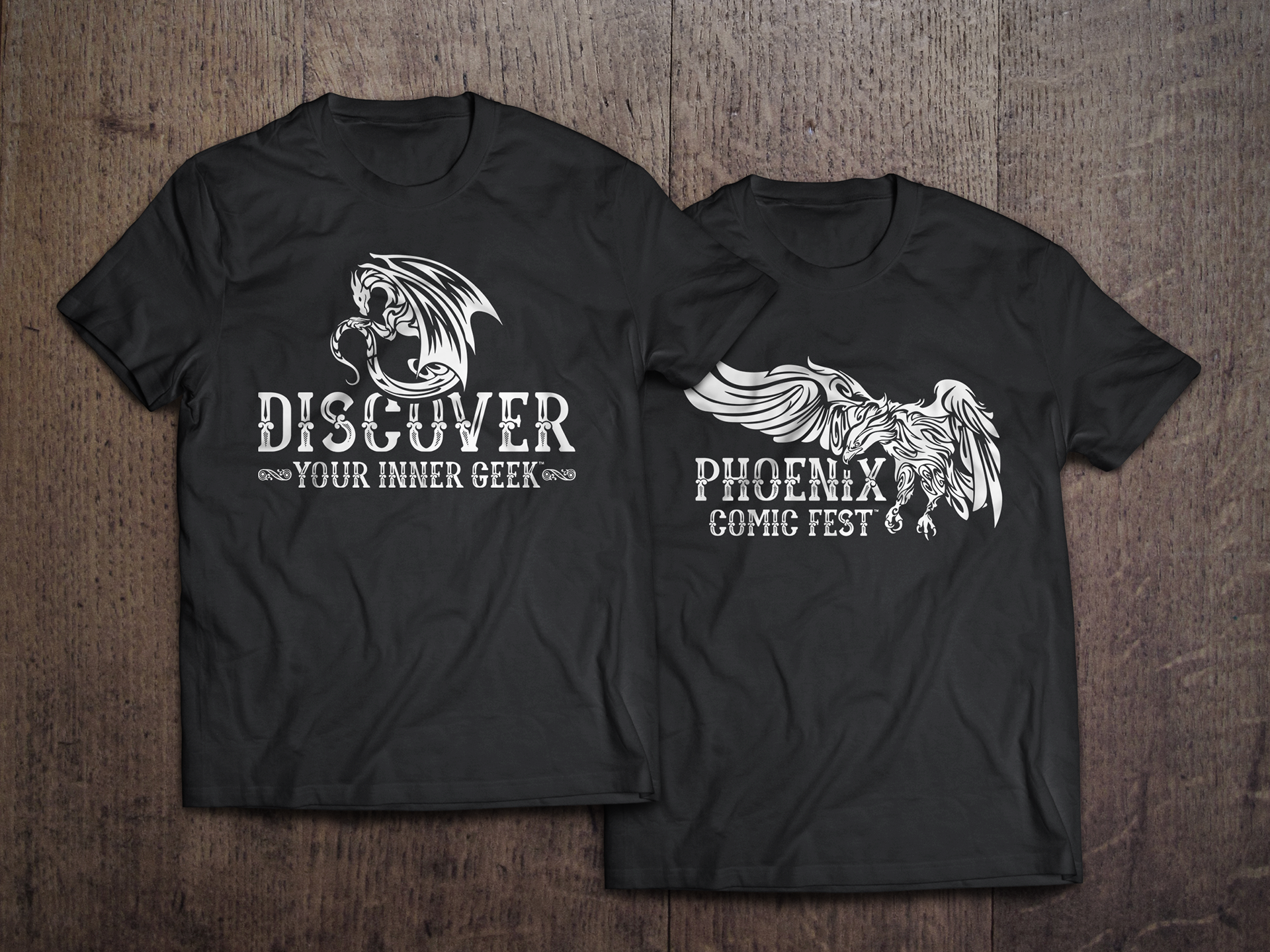 Some apparel designs for Phoenix Comic Fest 2018. The show runners were looking for a dragon themed design for one of the shirt options and wanted to incorporate the show's slogan. These were sold as men's and women's T-Shirts and hoodies at the event, as well as printed on tumblers.